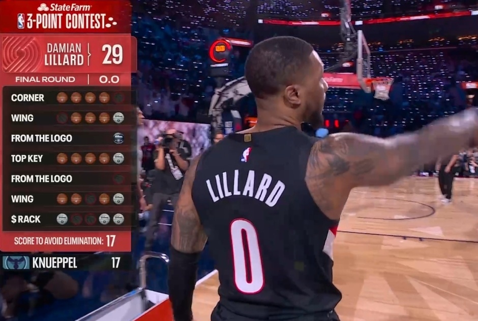 第八位登场的是开拓者球星利拉德,他本赛季因伤一场未打。利拉德第一个点命中3球,右侧弧顶命中4球包括花球,随后超远球不中。中路弧顶利拉德命中4球包括花球,左侧超远球不中,左侧弧顶5中5,最后一个花球点命中4球,利拉德最终得到27分。