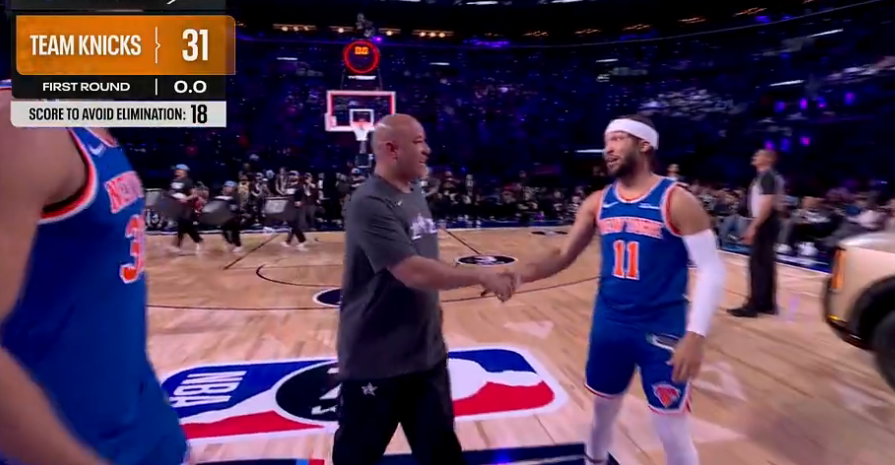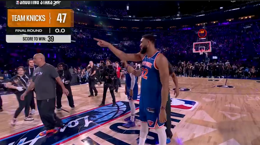 尼克斯队第四位登场,布伦森、唐斯携手队史名宿阿兰-休斯敦出战,他们前几个点表现出色连续得分,右侧弧顶接连打铁,中路唐斯命中,底角中距离阿兰-休斯敦命中,中圈四分点唐斯与布伦森连续进球,尼克斯队得到31分,携手24分的卡梅隆队晋级决赛。