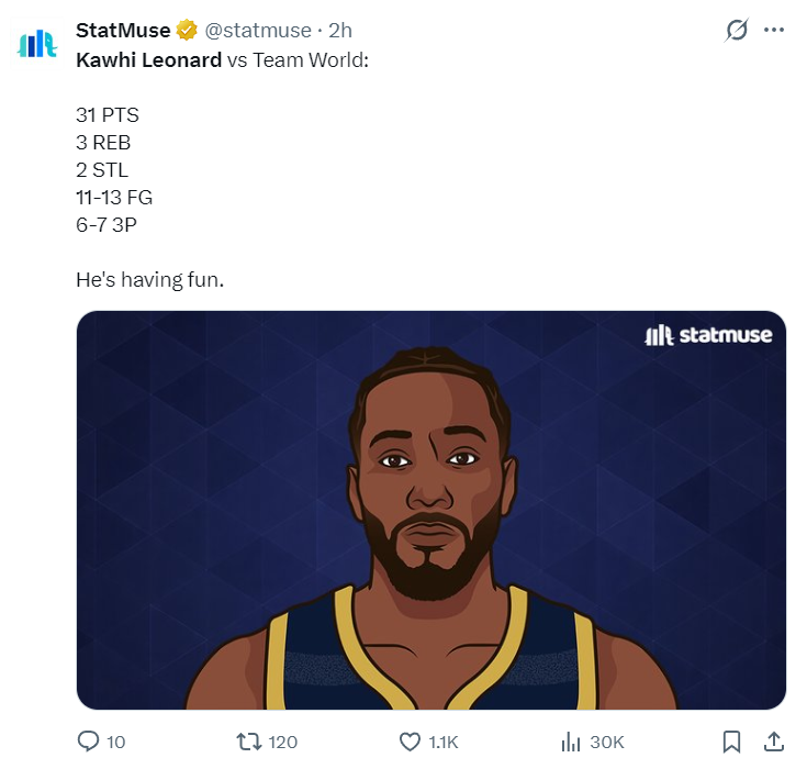 美国老年队VS世界队的比赛中,科怀-伦纳德再度打出了他战神卡的表现,在短短2分钟里一人连砍11分帮助老年队反超世界杯,单节12分钟,13中11,三分7中6,拿到31分3篮板0助攻2抢断,命中率高达84.6%,三分命中率高达85.7%,真实命中率108.2%。