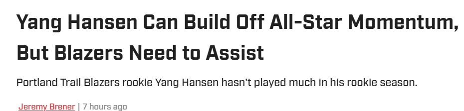 北京时间2月17日,《体育画报》撰文谈到杨瀚森,指出“杨瀚森可以借新秀赛势头更进一步,但开拓者也需要给他机会”,具体内容如下——