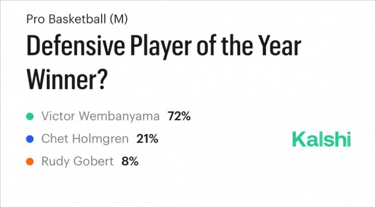 全明星赛告一段落后,距离25-26赛季结束还有2个月的时间。如今,赛季末的奖项评选或许已然成为最炙手可热的话题。与此同时,体育预测平台Kalshi也随之开启了一番忙碌景象,其中,本赛季的年度最佳防守球员恐没有悬念。截至目前,马刺球星维克托·文班亚马以72%的概率高居联盟第一,以完全碾压的态势领先切特·霍姆格伦和鲁迪·戈贝尔。对于这样的结果早在预料之中,要不是联盟强行按照65场常规赛的赛制标准作为门槛,或许文班早已经霸榜。本赛季至今,这位22岁的小将也用实际行动做出了回应,场均出场29.0分钟,贡献24.4分11.1篮板2.7盖帽1.0抢断。