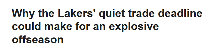 湖人篮球运营总裁兼总经理佩林卡对记者表示,球队为了保留未来灵活性,拒绝了一些机会。“我认为我们是有侵略性的,”佩林卡说,“侵略性的一种形式,就是拒绝那些可能不利于短期和长期未来的交易。即便最终没做任何操作,这也是一种侵略性。因为有时候,拒绝一个能短期补强但伤害长期规划的球员,其实很难。”