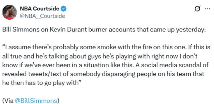 杜兰特选择加盟火箭队,原本就是为了夺冠的,但是本赛季的火箭队显然没有上个赛季的出色,甚至可以说赖以生存的防守都有所下滑。关于杜兰特本赛季在火箭队表现不好时,杜兰特怒火中烧的场面不少,甚至在替补席中直接摔水杯。当出现有社媒号吐槽同时期的队友,还有太阳的队友,加上拉黑同一个球迷,自然就被怀疑是杜兰特的小号。