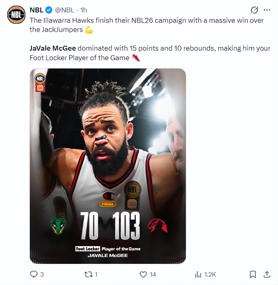 本赛季麦基在NBL场均25.1分钟,拿到19.3分10篮板2.1助攻0.9抢断1.8盖帽,命中率57%,罚球命中率78.4%。麦基留给NBA球迷的印象就是一个吃饼蓝领,但在NBL这种级别的联赛打球,麦基的表现跟文班亚马相差无几,也是持球一条龙面对3人防守暴扣。