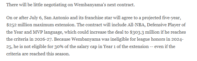 由于文班亚马在2024-25赛季没有资格参评联盟奖项,即便本赛季达标,他续约第一年的薪资也无法占到工资帽的30%。