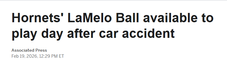 北京时间2月20日,据ESPN报道,黄蜂队控球后卫拉梅洛-鲍尔(三球)并未出现在球队伤病名单中,预计将在今日对阵休斯顿火箭的比赛中出战。此前一天,他刚在夏洛特卷入一起两车相撞事故。