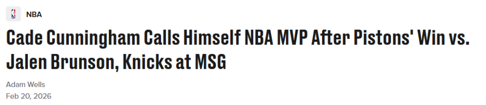 在率队大胜纽约尼克斯、再度打出统治级表现后,底特律活塞球星坎宁安坚信,NBA常规赛MVP奖杯已是他的囊中之物。昨日活塞以126‑111取胜后,坎宁安接受ESPN采访时,直言自己就是当下的MVP。