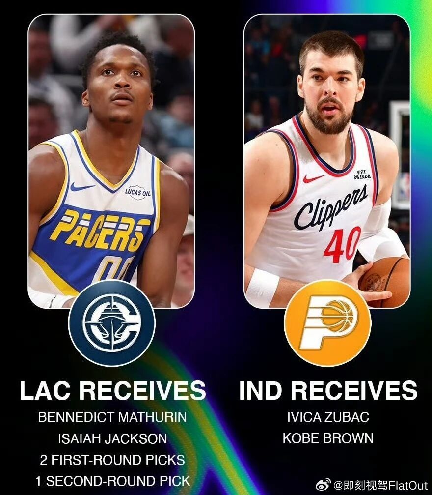 今年交易截止日前,快船送出祖巴茨+科比-布朗,从步行者换来的马瑟林+以赛亚-杰克逊+2个首轮签+1个次轮签。