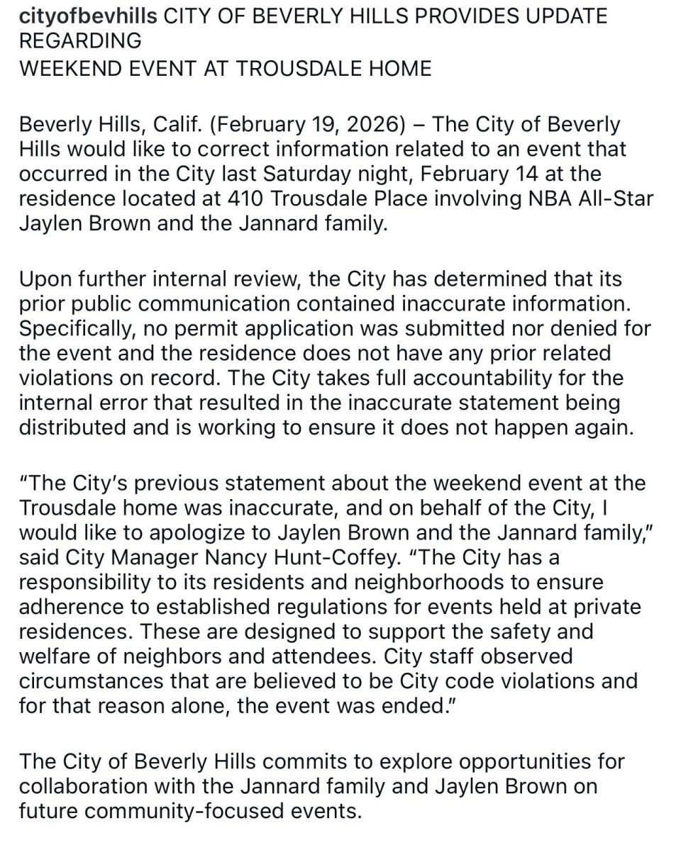 事件发酵后,贝弗利山市政府已公开向布朗作出道歉,并明确承认,此前发布的关于警方叫停活动原因的声明内容存在不实之处。该市在声明中写道:“经过进一步内部核查,市政府确认此前发布的公开信息存在错误,具体而言,该活动并未提交或许可申请,也未被驳回,该住宅也没有任何相关违规记录。市政府对此次因内部失误导致不实声明发布承担全部责任,并将采取措施避免此类情况再次发生。”