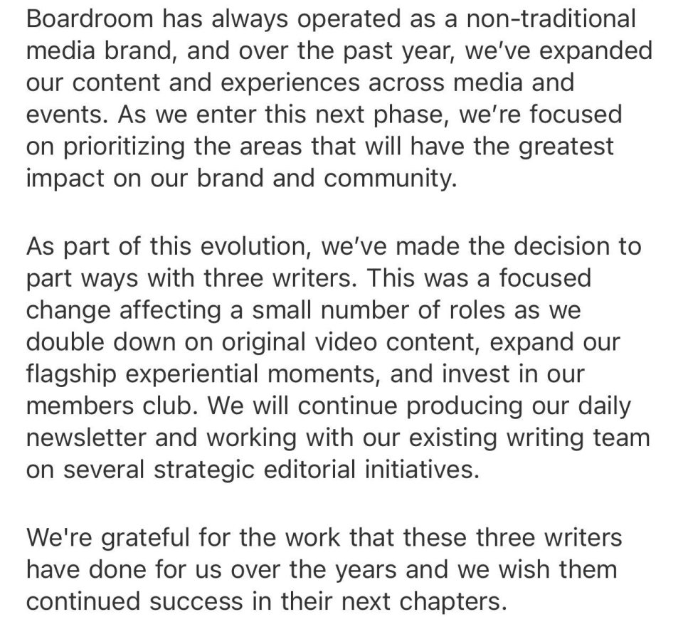 Boardroom一直作为一个非传统媒体品牌运营,在过去的一年里,我们扩大了在媒体和活动方面的内容和体验。随着我们进入下一个阶段,我们将重点放在那些对我们的品牌和社区影响最大的领域。
