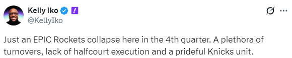 火箭耻辱输球引热议,赛后火箭队记Kelly Iko评论道:火箭在第四节遭遇史诗级崩盘。大量失误、半场进攻执行不力,以及尼克斯的顽强抵抗,导致了这一局面。