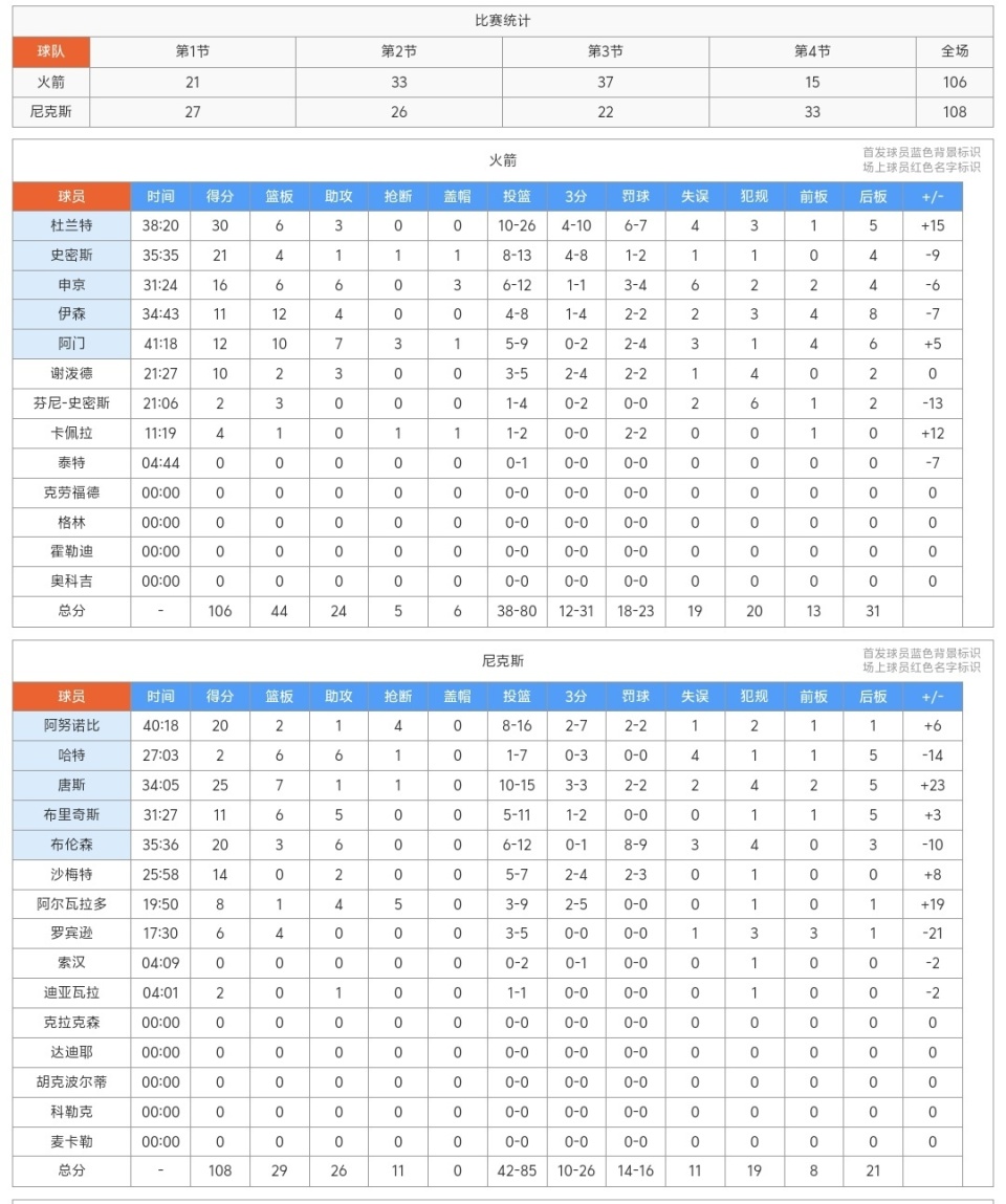 之后杜兰特与贾巴里连续打铁,比赛还剩6.1秒,火箭落后2分,只能犯规了,阿奴诺比两罚全中,杜兰特飚中三分,比赛还剩2.4秒,火箭落后1分继续犯规,沙梅特第一罚不进,第二罚命中,火箭落后2分,比赛还剩1.4秒,但是火箭已经没有暂停了,贾巴里发底线球,杜兰特超远三分不进,火箭惨遭尼克斯逆转了!