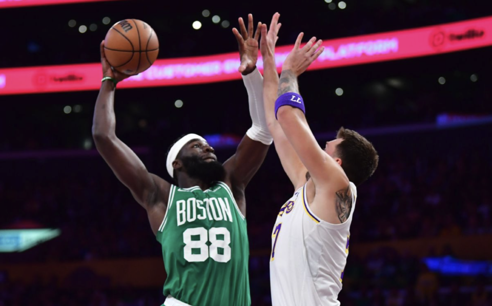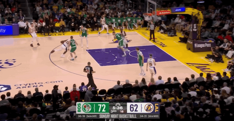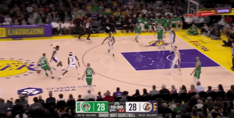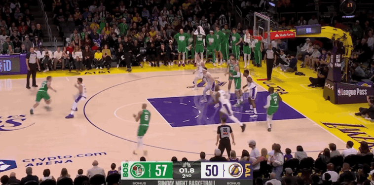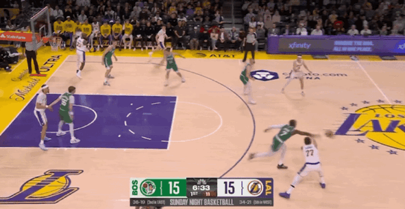 末节比赛开始,里夫斯突破抛投,武切维奇漂移投篮,詹姆斯和八村垒连续得分,普里查德连得6分回应。詹姆斯补篮得手,杰伦-布朗撤步跳投,东契奇突破上篮,普里查德和杰伦-布朗连续得分,凯尔特人打出一波8-0的进攻高潮,两队分差突破20大关。里夫斯急停跳投,普里查德三分命中击溃湖人。眼看两队分差始终在20分以上,湖人在比赛还剩下3分22秒换下全主力,提前宣告投降,比赛进入垃圾时间,最终湖人主场惨败凯尔特人。