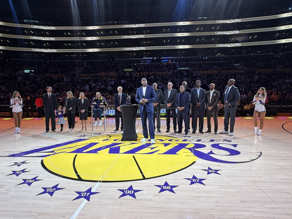 湖人主场邀请多位名宿莅临现场,为传奇教练帕特-莱利举行雕像揭幕仪式