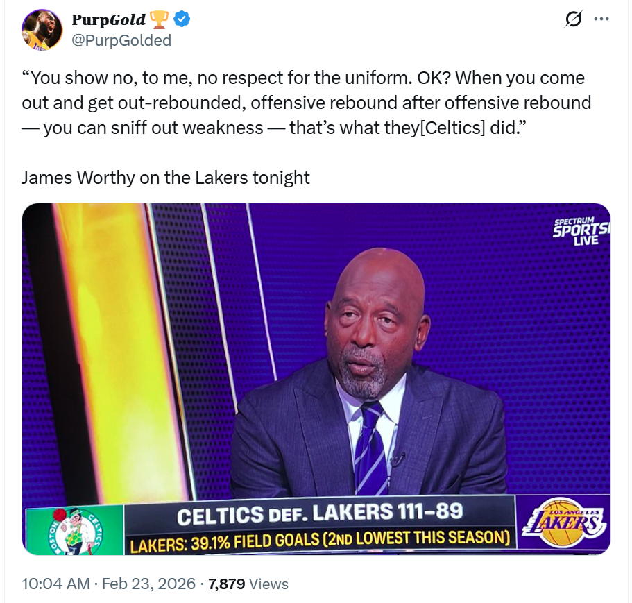 作为解说嘉宾的湖人名宿沃西更是一针见血的指出:“你们没有表现出对紫金军团球衣的尊重,一次又一次被对手抢下前场篮板,这让他们嗅到了你们的弱点。”