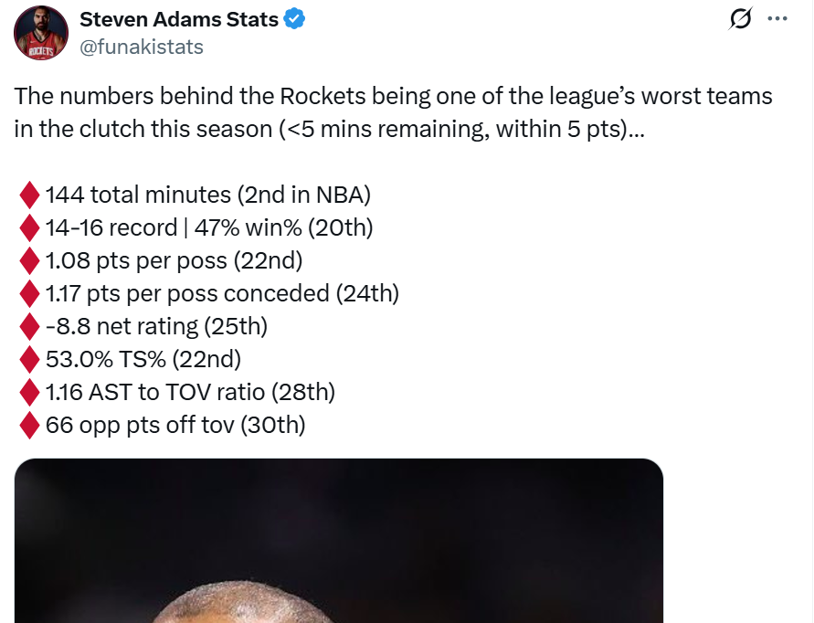 并且火箭队关键时刻各项数据均排在联盟垫底行列,开赛至今当比赛进入关键时刻时(最后5分钟,分差5分以内),火箭队战绩仅为14胜16负联盟第20。