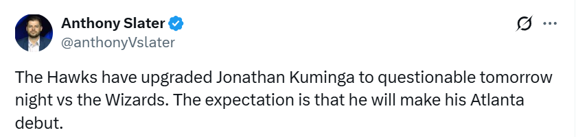 北京时间2月24日,据名记Slater报道,老鹰已将乔纳森-库明加明日对阵奇才的状态升级为出战成疑,预计他将在明日完成老鹰生涯首秀。