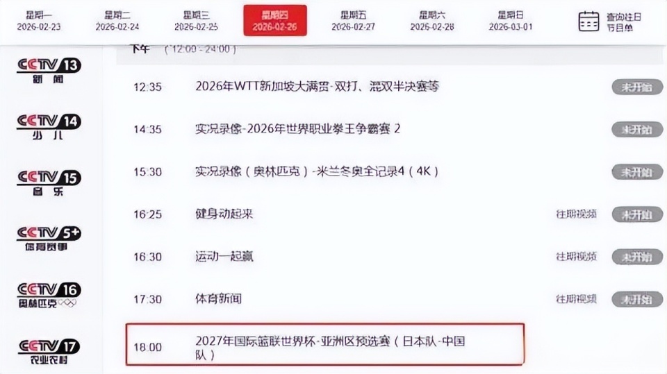 根据赛程显示,世预赛中国男篮vs日本队男篮的比赛,将会在北京时间2月26日18点05分开打。