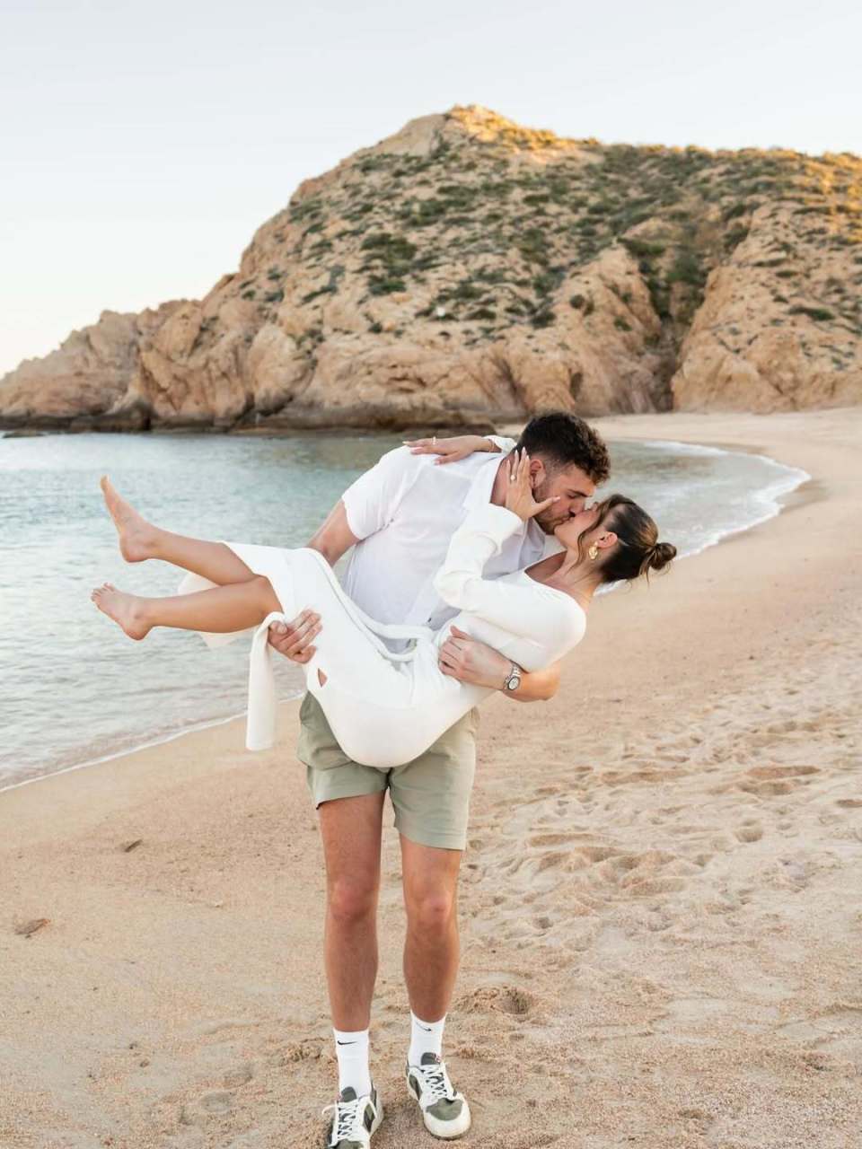 克林根与玛德琳的社媒配文写道:“永恒的爱。”照片中,两人在风景优美的海滩上,克林根单膝跪地求婚。玛德琳兴奋地戴上钻戒并展示,两人甜蜜拥吻。