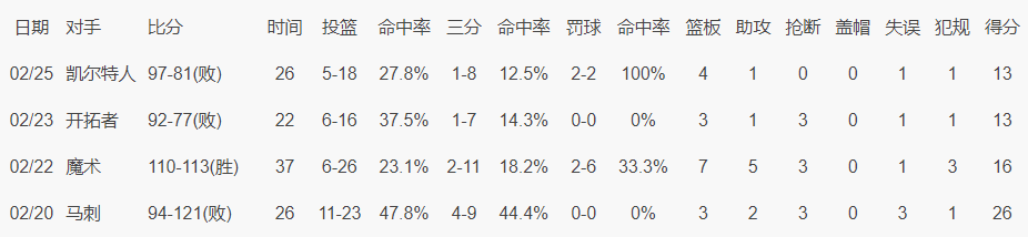 2月20日复出后杰伦-格林四场比赛83中28,三分球35中8,命中率33.7%,三分命中率22.8%,场均只能拿到17分。