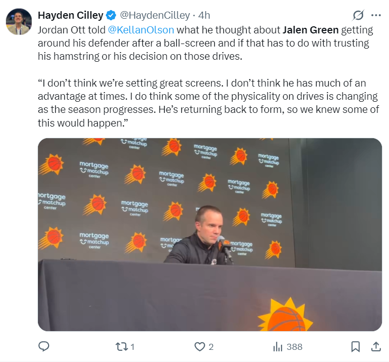 赛后太阳主帅乔丹-奥特谈到杰伦-格林减少了突破大多数都选择投篮,他表示:格林在进攻选择时跟此前发生了一些变化,他的腿筋正在逐渐痊愈,我们一早就预料到这种结果。