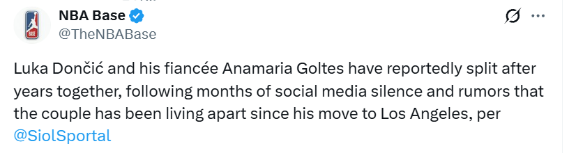 美国媒体甚至报道称,两人早在去年就已经分手,就在东契奇被交易到洛杉矶湖人队之后不久。据当地媒体分析,搬到洛杉矶带来了新的圈子、新的环境,也带来了新的诱惑。