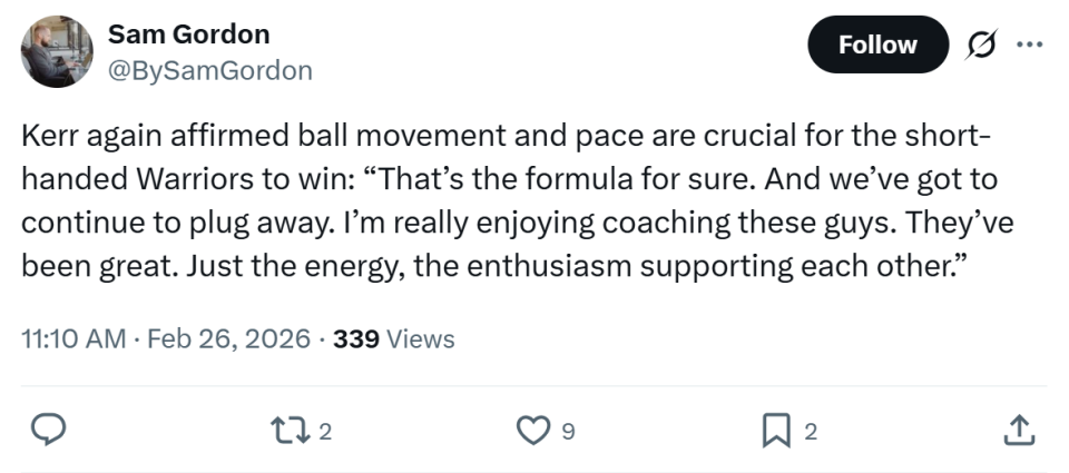 加上赛季报销的巴特勒,以及一直因伤缺席的库里与波神,本场比赛勇士队5大核心悉数缺阵,算上双向合同的莱昂斯才摆出9人轮转。
