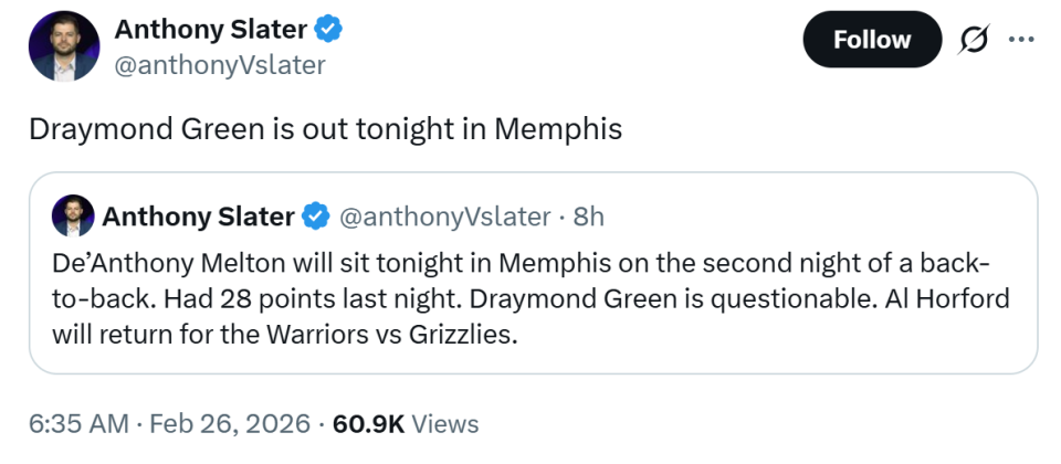 除此之外,追梦也在赛前突然因伤缺席,勇士随队记者Anthony Slater给出的原因是左下背部伤病管理。
