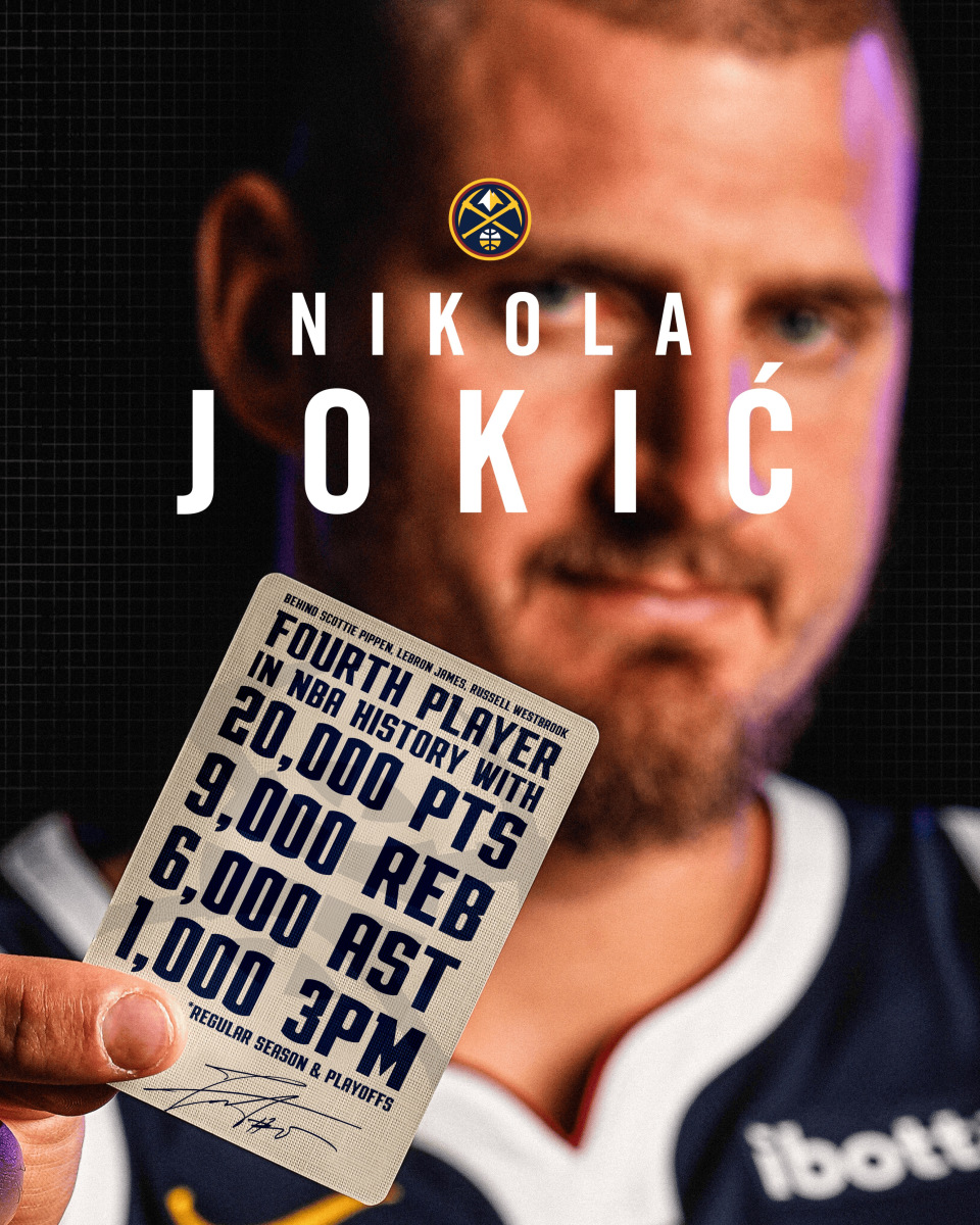 掘金官方:约基奇2万分9千篮板6千助攻1千三分,历史第四人