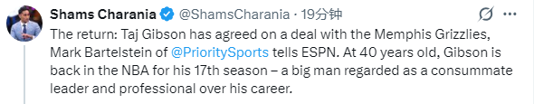 名记shams还报道,据ESPN的马克-巴特尔斯坦透露,泰-吉布森已与孟菲斯灰熊队达成协议。40岁的吉布森将重返NBA,开启他的第17个赛季,这位大个子球员在其职业生涯中一直被公认为一位完美的领袖和职业球员。