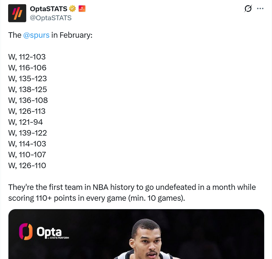 如果算上具体得分,那么这支年轻的马刺队更是打破尘封79年之久的纪录,成为NBA历史至今首支在单月份每场比赛总得分都达到110+分,而且还保持全胜的球队。