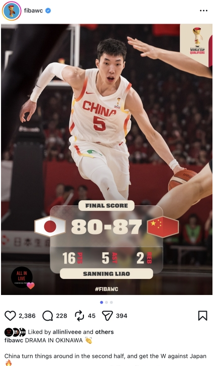 赛后,FIBA官方在社媒上发布本场比赛赛果,并配文:“a sneaky win”。而“sneaky win”往往被形容为出乎意料的胜利。