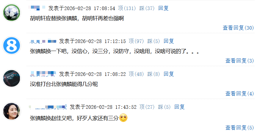 网友们有不同的看法,认为可以用胡明轩或赵嘉义替代张镇麟,后者与日本男篮一战约8分钟里没有任何数据进账,下半场更是被DNP,作为曾经中国男篮最佳前锋,表现却再度令人大失所望,从而又一次成为众矢之的。