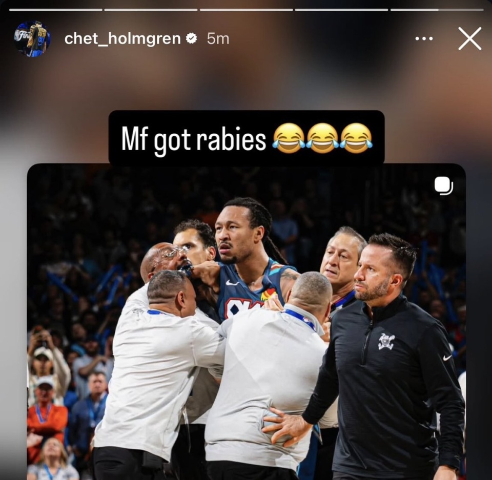 雷速体育3月1日讯 雷霆球星霍姆格伦今日更新社媒,晒出了昨日队友杰林·威廉姆斯与约基奇的冲突瞬间,并配文写道:“这家伙得了狂犬病。”