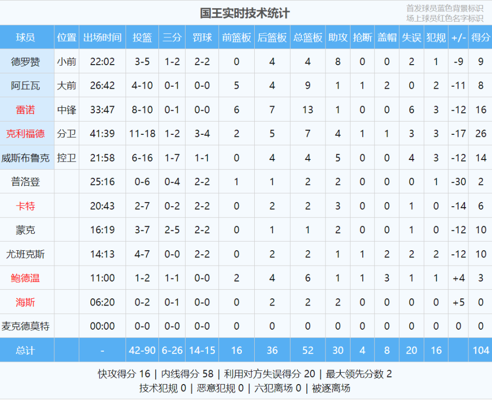 湖人首发:东契奇、里夫斯、斯玛特、詹姆斯、艾顿。国王首发:威少、克利福德、德罗赞、阿丘瓦、雷诺。威少开局手感不佳,首节5中1仅得2分3助攻3失误。国王全队三分球5中0,第一节打完,湖人36-18领先国王18分。