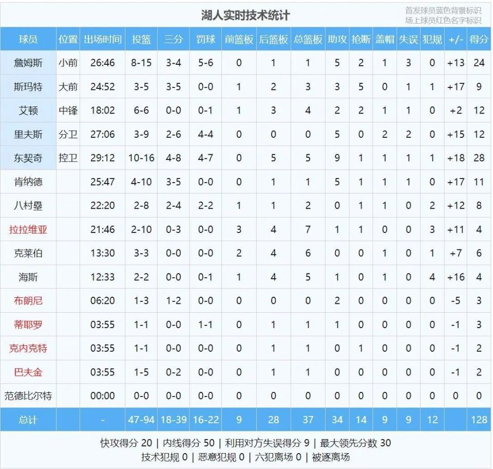 三节战罢,湖人96-76领先整整20分。詹姆斯前三节11中5得到14分,第四节4中3砍下10分。最后半节双方换上纯替补阵容,全场结束,湖人128-104大胜国王24分,背靠背取得2连胜。东契奇28分5板9助、詹姆斯24分5助2断。