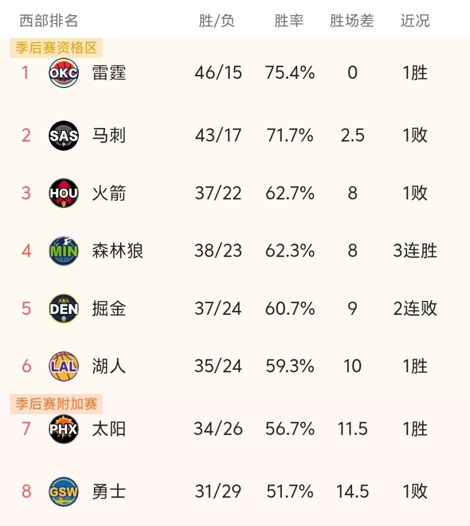 随着掘金108-117输球,火箭湖人利好,NBA最新积分榜:西部3-6名太乱!