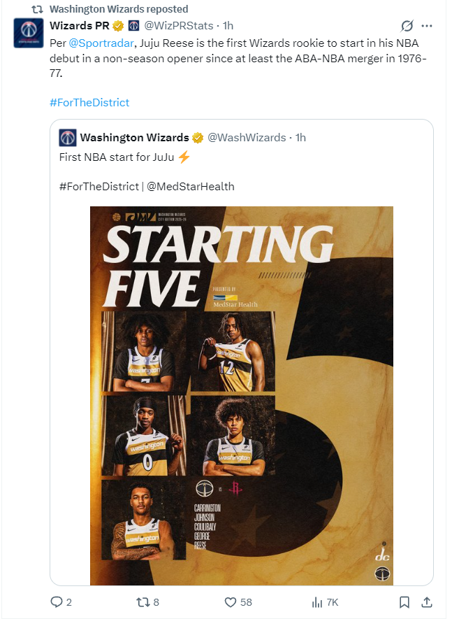 朱利安-里斯,成为1976-77年ABA与NBA合并以来,首位非赛季揭幕战完成NBA首秀的奇才新秀。