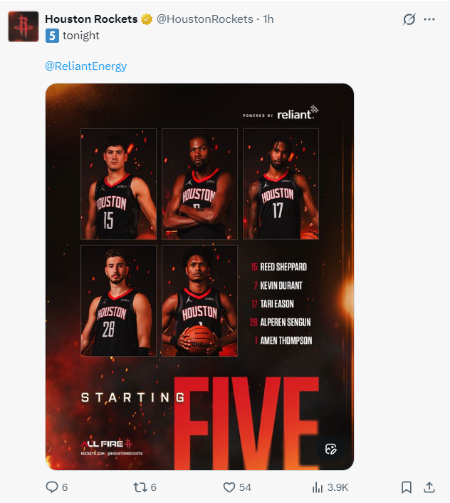 火箭:谢泼德、阿门、伊森、杜兰特、申京;