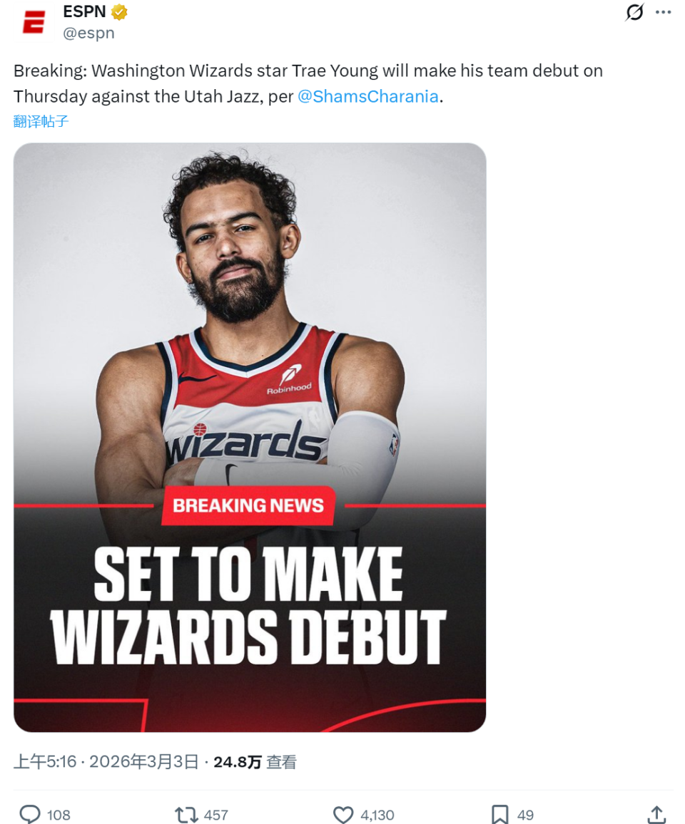 北京时间3月3日上午,据NBA名记Shams报道,特雷杨将在本周五主场对阵爵士的比赛中迎来奇才生涯首秀。奇才主教练布莱恩-基夫印证了这一报道:特雷杨预计在首秀时出战17-20分钟。因腿部伤势,2026年特雷杨还没有出战过。