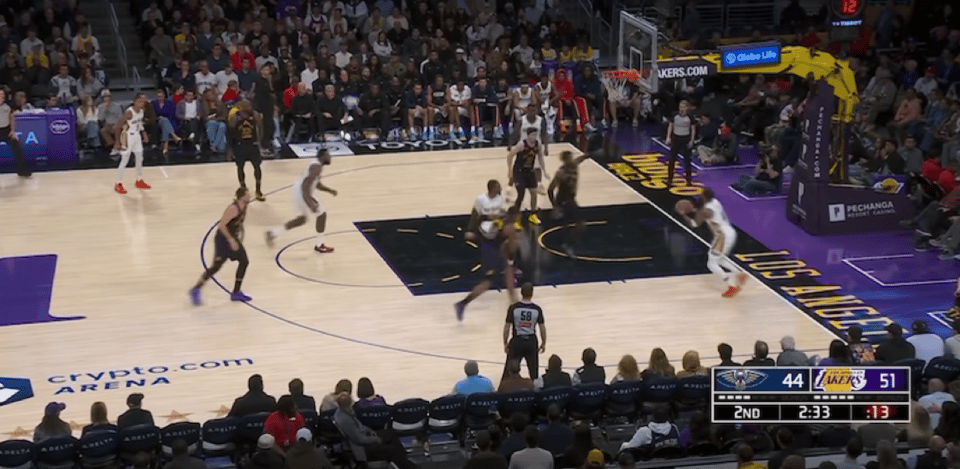 末节比赛开始,拉拉维亚空切上篮,詹姆斯2罚1中,萨迪克-贝和穆雷连续三分命中。斯马特抛投得手,麦克格温斯突破得手,艾顿跳投打进2+1,鹈鹕球员连续走上罚球线5罚4中。鹈鹕打出一波7-0的进攻高潮,海斯扣篮止损,里夫斯三分命中,湖人打出一波14-0的进攻高潮扭转局势。鹈鹕超过4分钟一分不得,锡安连续上篮得手打破僵局,东契奇2罚全中,斯马特三分命中。锡安错失追分投篮,东契奇三分命中,湖人取得双位数领先优势。穆雷打进2+1,里夫斯2罚全中,穆雷和墨菲连续错失追分投篮,鹈鹕大势已去,最终湖人成功逆转击败鹈鹕。