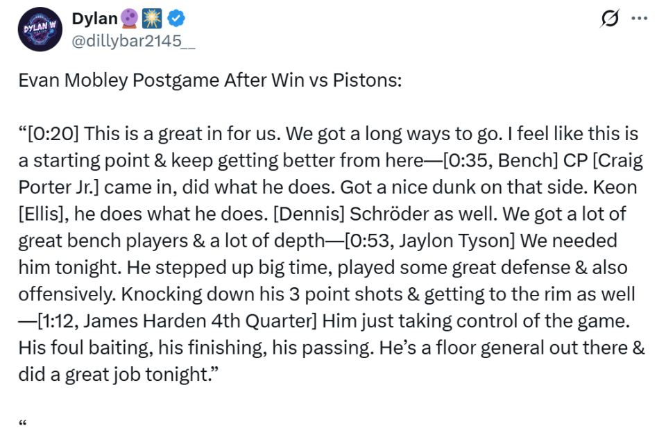 面对哈登这样的表现,莫布利赛后公开称赞道:“他在第四节比赛接管了比赛,无论是造犯规,还是终结与传球,他都展现出了出色的球场指挥能力,今晚的表现非常出色。”