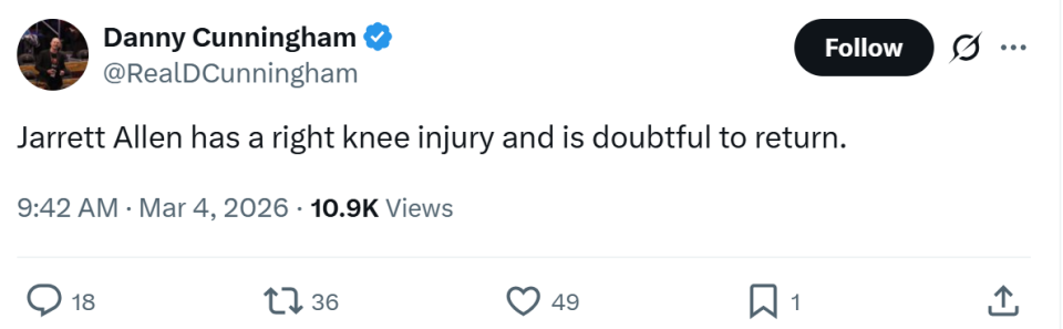 艾伦因伤退场,骑士官方宣布他因右膝伤势本场比赛小概率回归,最终他并未回归,全场出战20分钟,7中4得到8分3篮板。