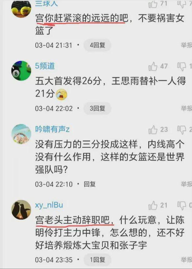一年多以来,宫鲁鸣练不出新人,甚至老将不进反退,罗欣棫就是明显的例子。球迷嘲笑道,宫鲁鸣是个人才啊,让中国女篮第四节得9分,最后让巴西女篮超远三分打平,赶快主动辞职吧。诸位,你们说呢?