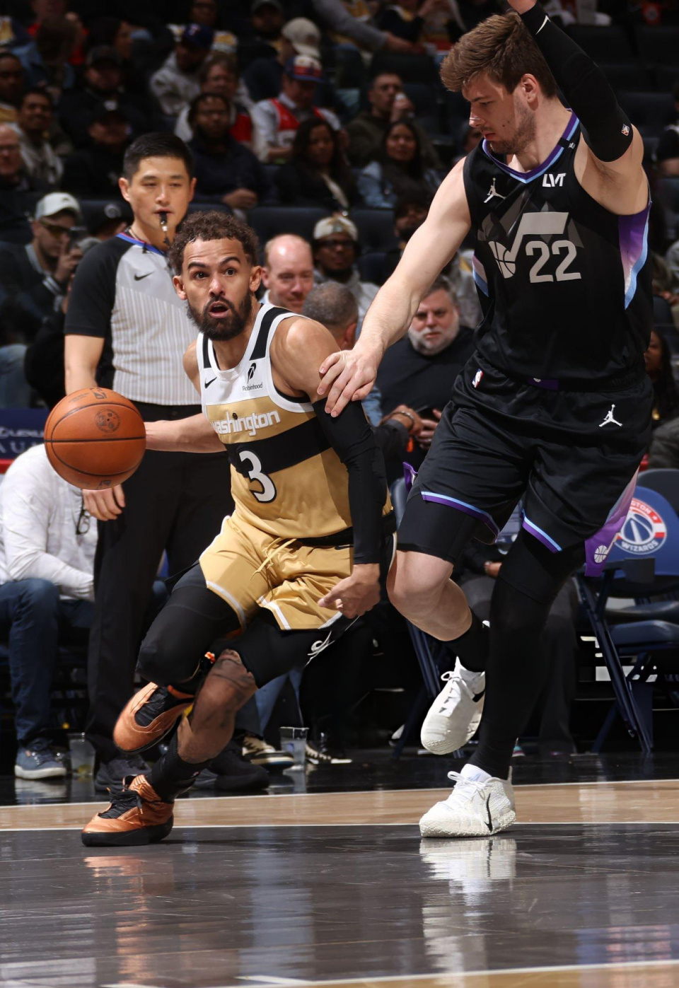 特雷杨今天迎来首发出场,他的亮相获得了奇才队主场球迷的热烈欢迎。比赛开始之后,特雷杨借助挡拆,很快完成一记突破上篮,打进奇才队生涯首球。不过本节后半段时间内,特雷杨三次三分出手全部偏出,首节得到2分2助攻。次节比赛中,特雷杨连续造成犯规命中罚球,随后他再次完成一记上篮,不过外线投篮还是不中,单节拿到5分1助攻1抢断。