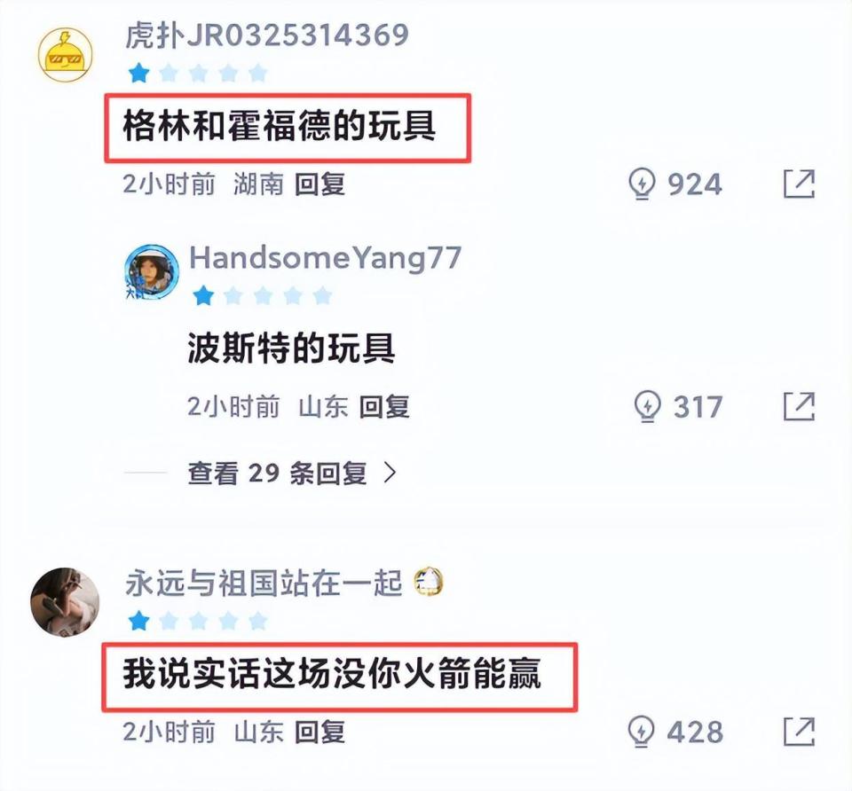 也难怪有不少球迷纷纷吐槽:“简直就是格林和霍福德的玩具”、“说实话没你火箭能赢”、“你怎么这么软啊”、“被打成孙子了”......