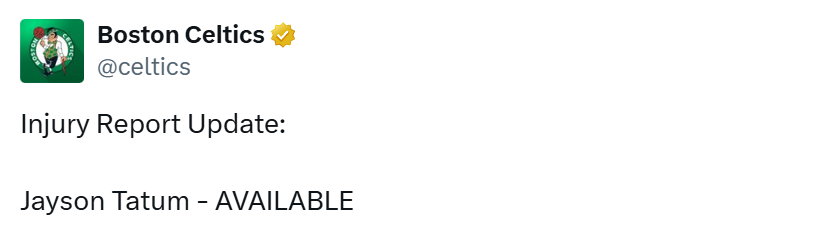 时隔298天!凯尔特人官宣塔图姆正式复出 联手布朗再冲总冠军