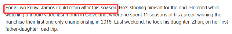 《纽约邮报》还报道,据我们所知,詹姆斯可能会在本赛季结束后退役,他正在为生涯结束做好准备。上个月在克利夫兰,他在观看致敬视频时落泪了,他职业生涯有11个赛季在那里度过,并在2016年带领骑士赢得了队史首个也是唯一一个总冠军。上周末,他带着女儿朱莉进行了首次父女客场之旅。