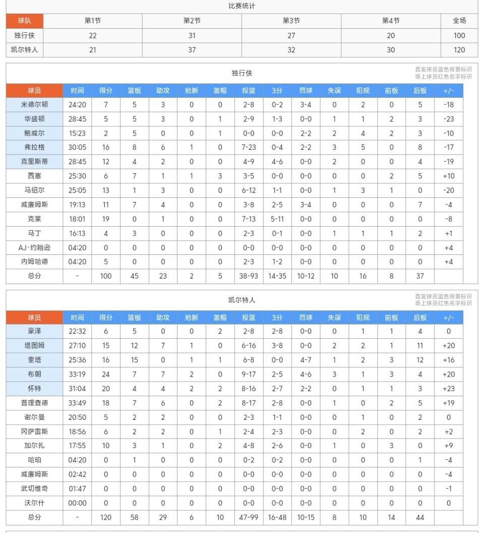 下半场第三节易边再战,塔图姆逐渐适应比赛,不过杰伦布朗等人的比赛状态显然更好,凯尔特人将优势扩大到了两位数,末节凯尔特人打崩了独行侠,最终拿下了胜利!