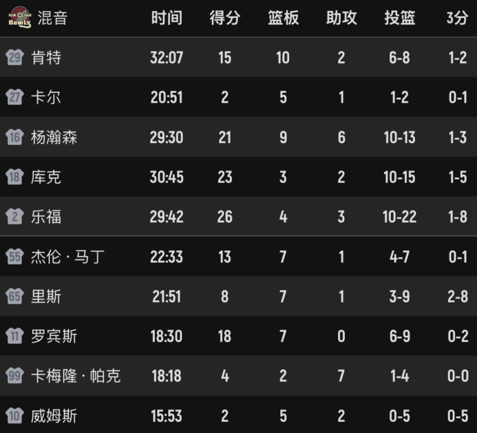 看看本场数据情况,杨瀚森投篮13中10,拿到21分9板6助(3个前场板),还有2抢断3盖帽,失误3次犯规3次,正负值18全场最高。队友乐福22中10,三分球8中1,太铁了,得到26分4板3助,效率不及杨瀚森。